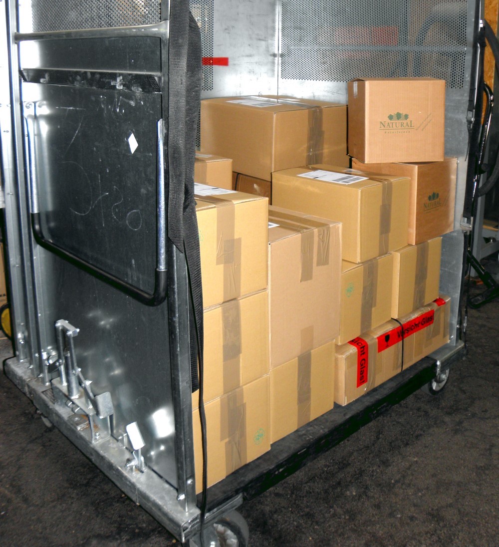 Die Pakete werden nicht einzeln an den Abholer abgegeben sondern in Rollboxen eingestellt. Dadurch veringert sich die Gefahr der Beschädigung erheblich.