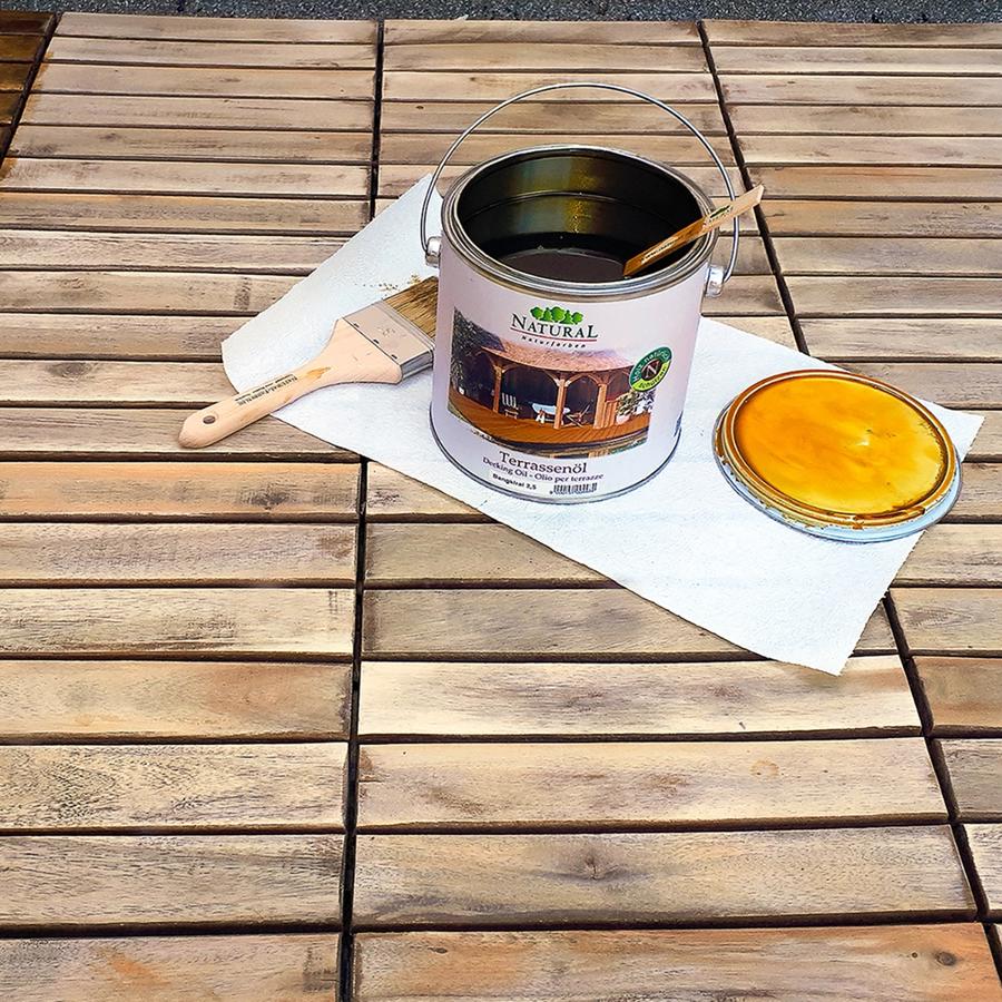 Möbel u Bodenelemente aus harten Importhölzern vor Ingebrauchnahme besonders gut durchtrocknen lassen.Tipp:Nicht bewittertes Terrassenholz bzw. Gartenmöbel nach 10-14Tagen mit einer sanften Seifenlösung aus Natural Spezial-Reiniger  ( 50ml + 5lt lauwarmen Wasser )  abwischen. Nachpflege:Frei bewitterte Gartenmöbel oder Holzterrassen 1 x jährlich nachstreichen. Zur laufenden Reinigung empfehlen wir den Terrassen und WPC Cleaner.Fragen zum Terrassenöl wurden schon beantwortet:Terrassendielen streichen: mit Holzlasur oder Terrassenöl?